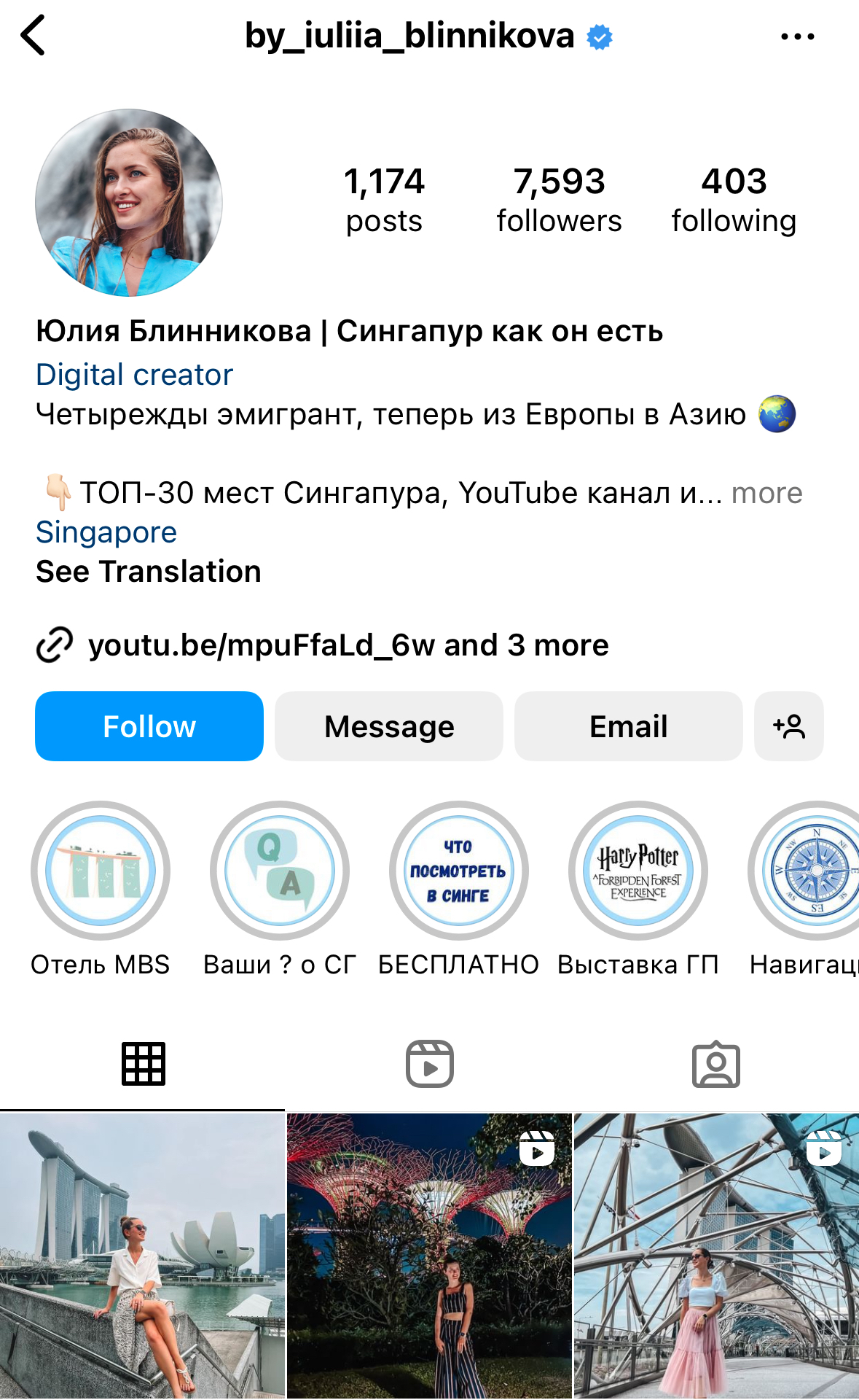 2) рекомендую в жирной строке профиля использовать слово "путешествия", так как это поможет алгоритму лучше регистрировать твой контент. Например, "сингапур и путешествия".
