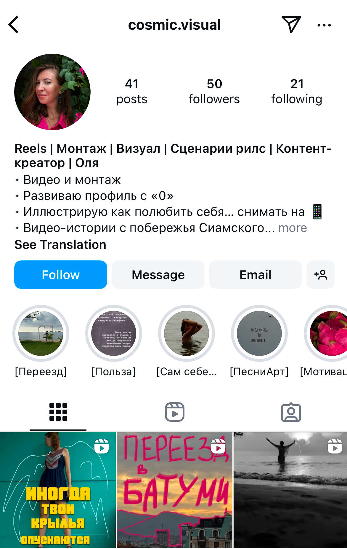 Ошибки в упаковке: 1) В жирной строке профиля я рекомендую иметь имя на первом месте — чтобы читателям было легко понять, как тебя зовут. Также сейчас слишком много всего в жирной строке получилось, рекомендую сократить, например, Оля | Reels | Монтаж | Сценарии | Визуал