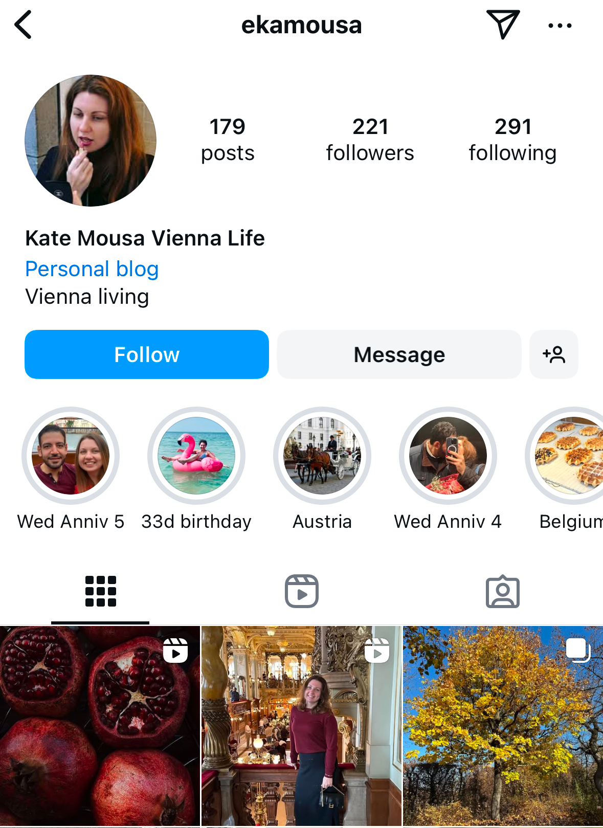 6) В хайлайтах также рекомендую немного навести порядок, сейчас их очень много. Не обязательно удалять какие-то, но важно, чтобы первые 3-4 хайлайта были "причесаны". Первых хайлайт лучше сделать о тебе, а вот по следующим нужно сделать так, чтобы они были интересны новой (!) аудитории. Второй хайлайт должен быть по теме твоего блога с разбором проблемы и ее решением, третий хайлайт можно поставить с отзывами по работе с тобой, четвертый хайлайт с интересными местами в Вене, а далее уже в свободном порядке.