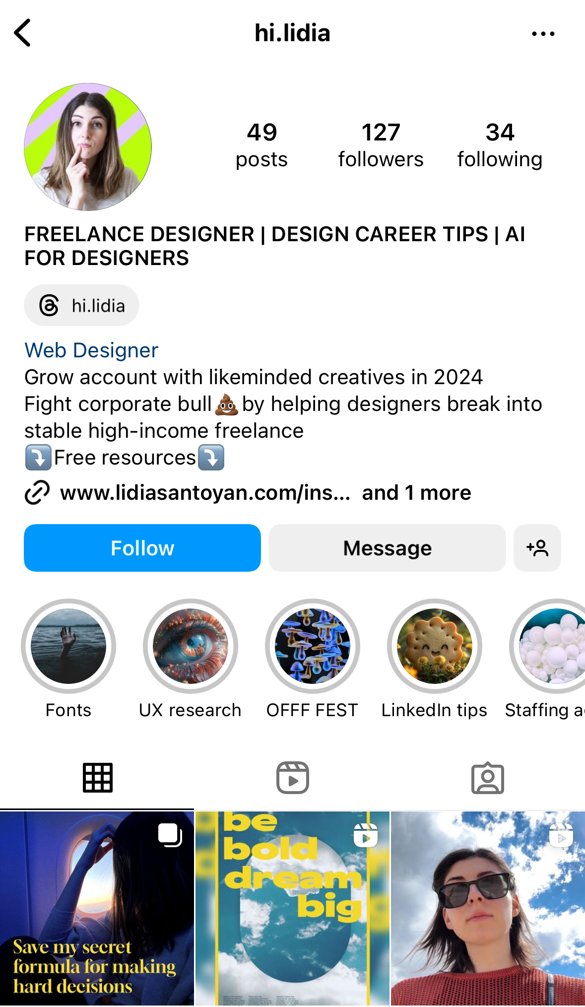 Направлять лучше всего в хайлайт с сильной болью твоей целевой аудитории. Этот хайлайт должен стоять самым первым, и у него прямо на обложке должно быть написано что-то в формате "начни тут". Но ЦА у этой проблемы из хайлайта должна быть широкая! В идеале не только проф дизайнеры, но и начинающие и интересующиеся.