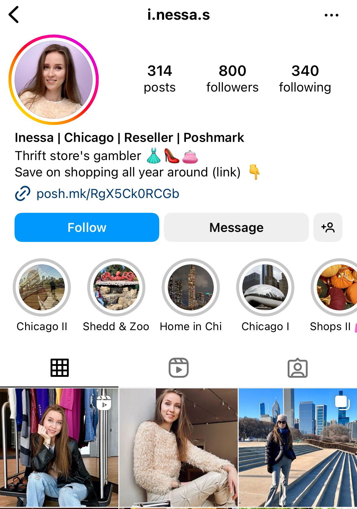 5) я бы рекомендовала подчистить первые 3-4 хайлайта, сейчас они больше для друзей в формате много-много всего. А первые хайлайты должны отражать тебя как личность и тематики в твоем блоге. Я бы рекомендовала сделать такие хайлайты: 1.о тебе и твоей истории, 2.обзоры на любимые секонды, 3.образы с использованием одежды из секондов, 4.подборка любимых мест в Чикаго.