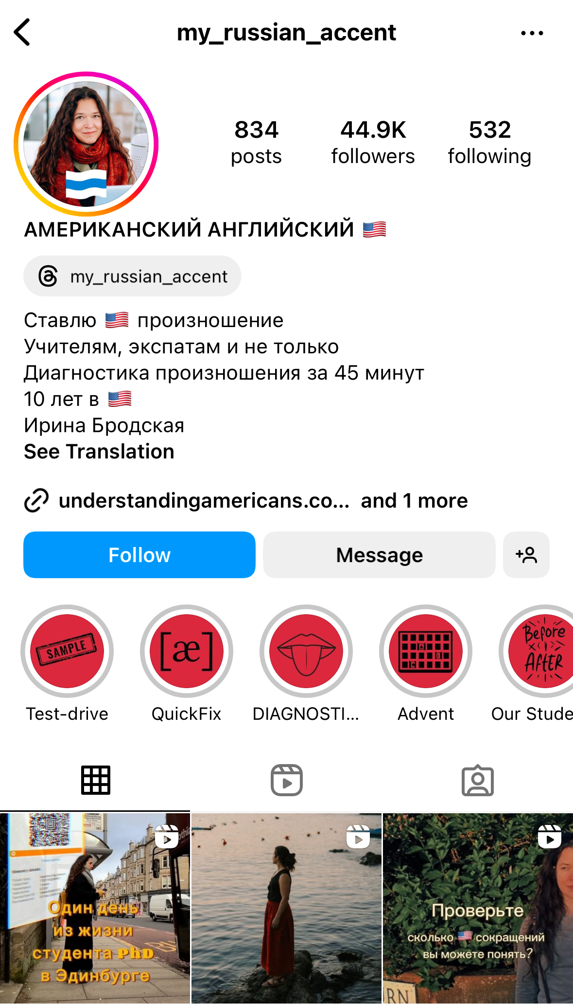 https://www.instagram.com/reel/C5Wj0FgN3uS/?igsh=MTgyNjdocG1mZXBuag==)7) можно периодически делать короткие ролики, где ты сначала говоришь фразу с русским (не преувеличенным, а средним русским) акцентом, а затем правильно с американским (пример: