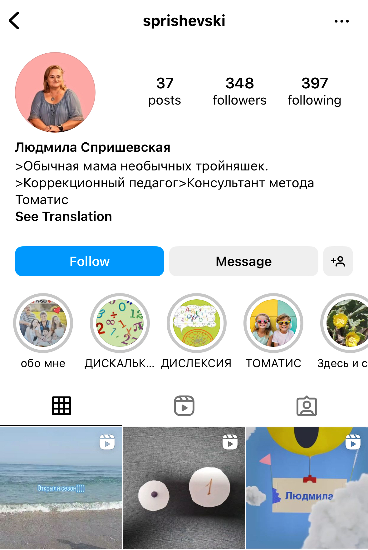 Ошибки в упаковке: 1) Я бы рекомендовала немного изменить жирною строку описания. В ней я советую писать не только имя, но и ключевые слова по тематике блога – так тебя будут находить как пользователи инстаграм через поиск, так и сам алгоритм приложения будет лучше регистрировать твой блог и контент. Например, Людмила Спришевская | образование нейротипичных детей. То есть задача — в жирной строке прописать нишу блога, но сделать это, используя ключевые слова, которые связанны с нишей и по которым зритель стал бы искать блог на эту тему.