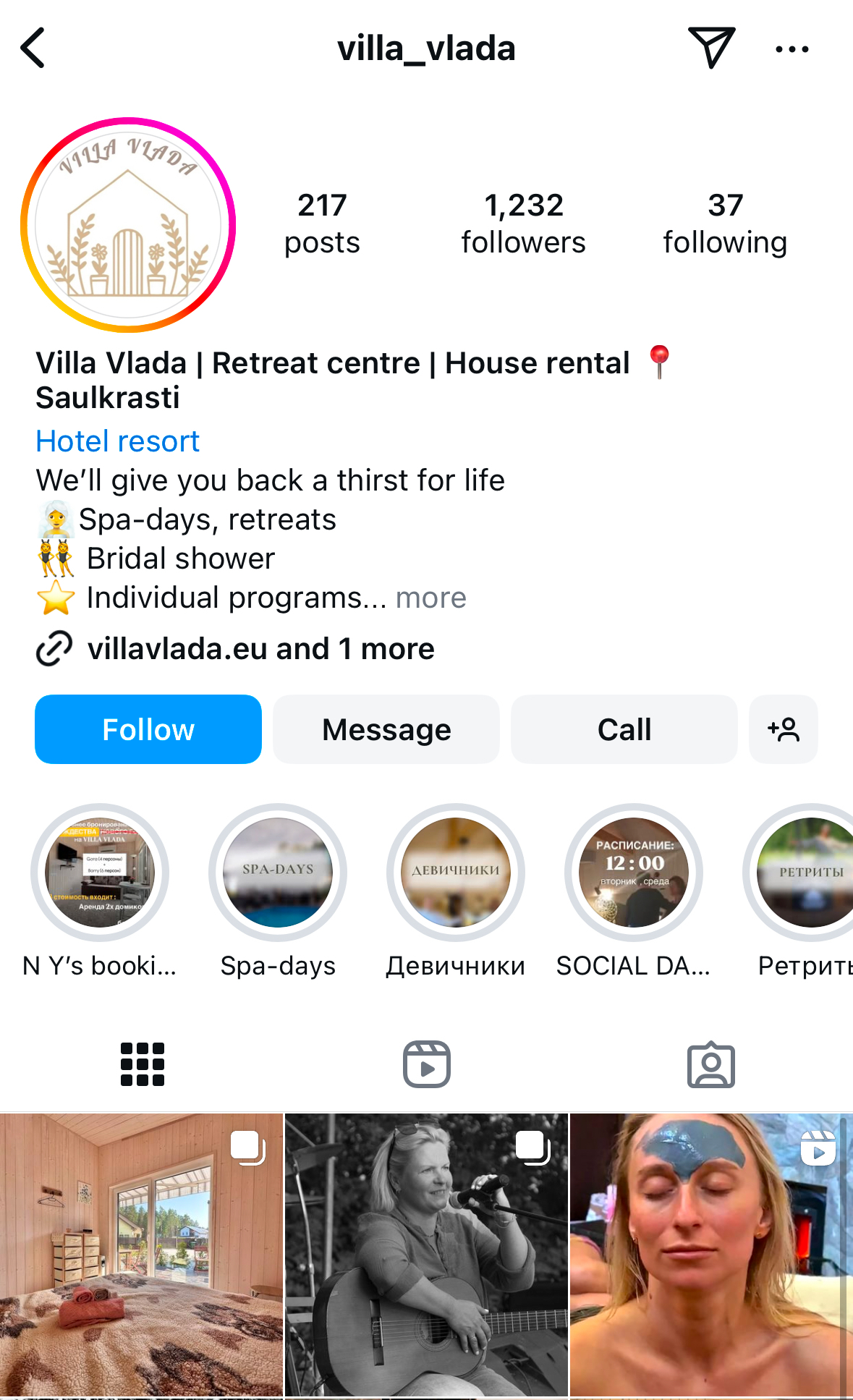 2) Главная цель блога — продать подписку на сам блог, и затем из подписчиков переводить людей в клиенты. Шапка профиля должна отвечать на вопрос "для чего зрителю подписываться на блог?". По сути блог сейчас направлен только на горячих клиентов, которые прямо сейчас ищут дом для аренды или спа центр, а это узкая целевая аудитория.