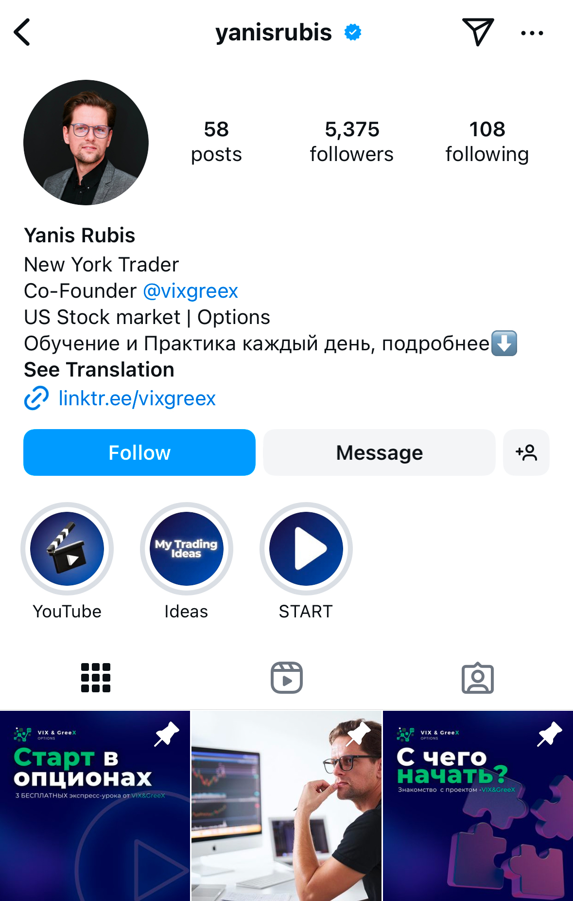 2) Я рекомендую в жирной строке писать ключевые слова по тематике блога – так тебя будут находить как пользователи инстаграм через поиск, так и сам алгоритм приложения будет лучше регистрировать твой блог и контент. Например, Янис Рубис | Трейдер | Нью-Йорк